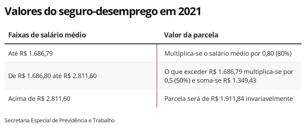 O valor recebido pelo trabalhador demitido depende da média salarial dos últimos três meses anteriores à demissão. No entanto, o valor da parcela não pode ser inferior ao salário mínimo vigente (R$ 1.100). Veja abaixo: