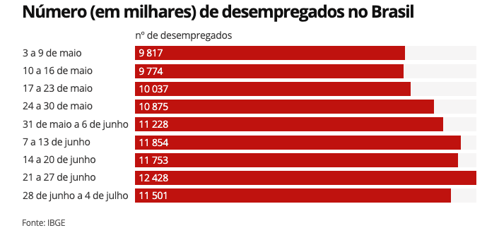 O número de trabalhadores desocupados diante da pandemia teve ligeira queda na primeira semana de julho. Segundo dados divulgados nesta sexta-feira (24) pelo Instituto Brasileiro de Geografia e Estatística (IBGE), entre os dias 28 de junho e 4 de julho, eram 11,5 milhões de pessoas desocupadas – na semana anterior, eram 12,4 milhões.