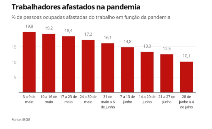 A pesquisa do IBGE apontou também que caiu em cerca de 2 milhões o número de trabalhadores afastados devido ao distanciamento social provocado pela pandemia, mantendo a trajetória de queda verificada desde que começou o processo de flexibilização da quarentena.