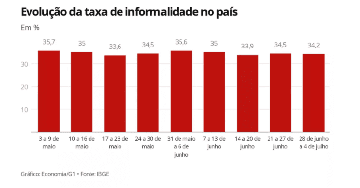 A taxa de informalidade passou de 34,5% para 34,2% entre a quarta semana de junho e a primeira semana de julho, o que o IBGE considera como estabilidade do indicador. Já na comparação com a primeira semana de maio, o instituto aponta recuo da taxa (era de 35,7%).